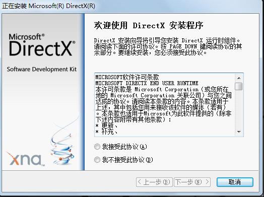 安装完毕后,将提示您安装DirectX,如果您确认您已安装过Dx9.0c及以上版本,您可以选择取消; 强烈推荐您安装以确保《仙剑奇侠传五前传》的正常运行。选择”我接受此协议“并点击"下一步"按钮